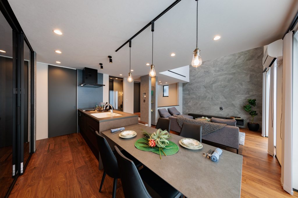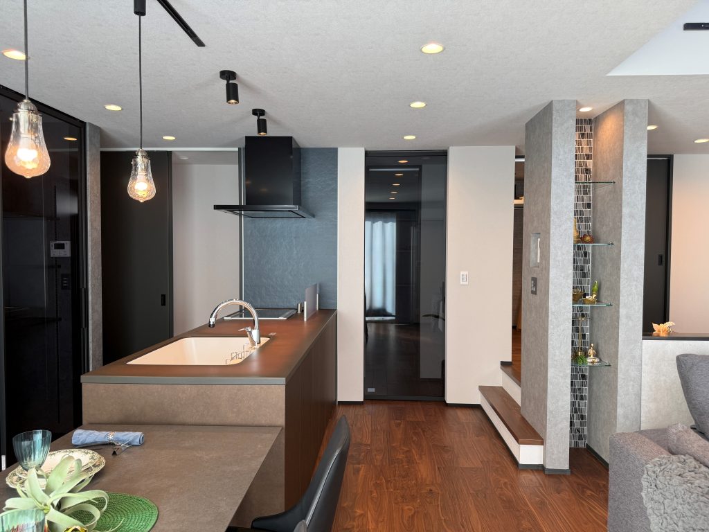 ◆吹抜けや階段を絡めたDEN、ガラスドアのパントリー、天井ジャストドア、タイル、アイアン、ペンダントライトなどを採用した贅沢な邸宅。