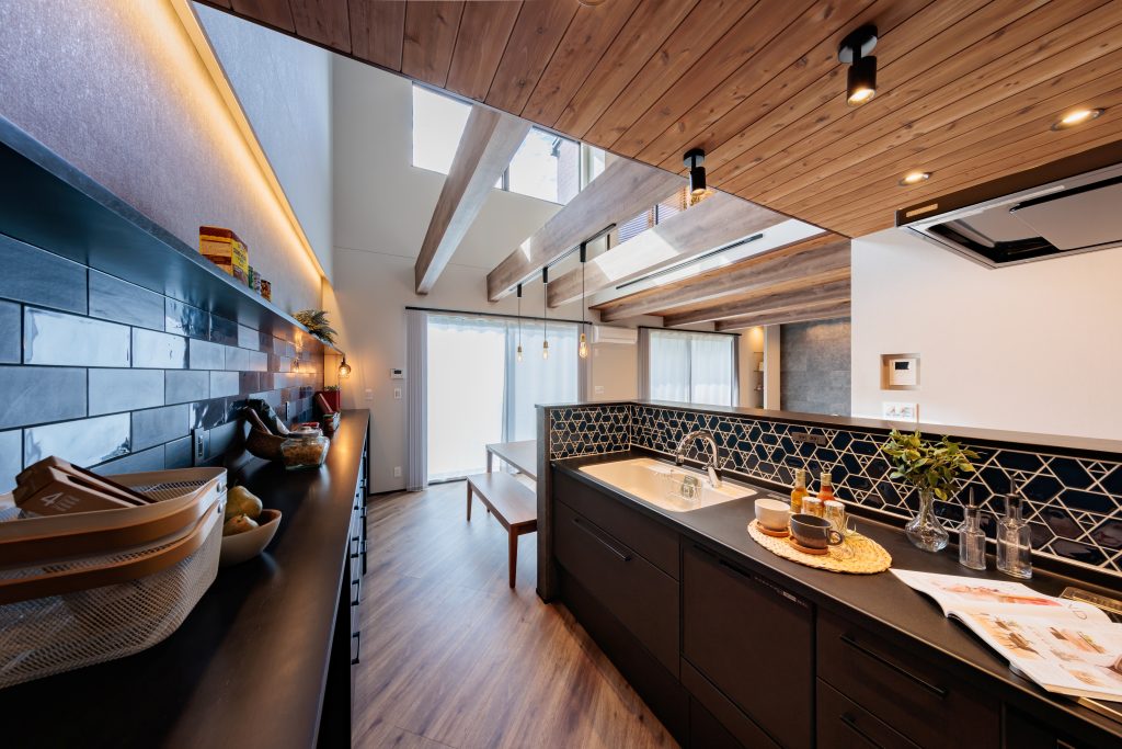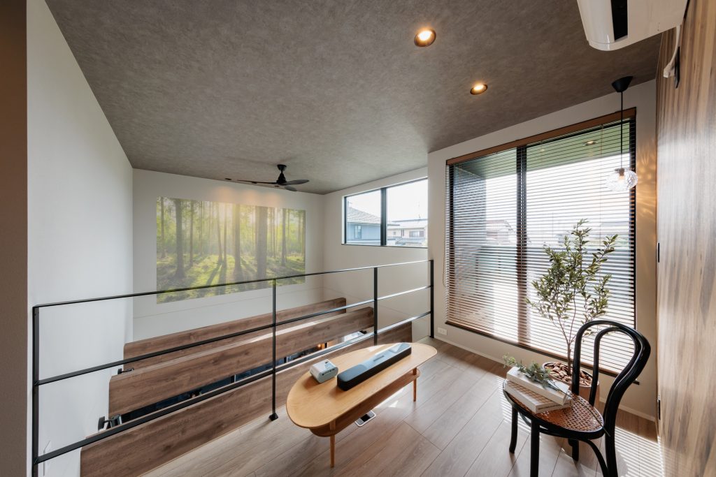 ◆吹抜けを利用したシアタースペース・見せ梁・天井ジャストドア・タイル・アクセントクロス・ペンダントライト・アイアンなど各箇所にこだわりを散りばめました♪